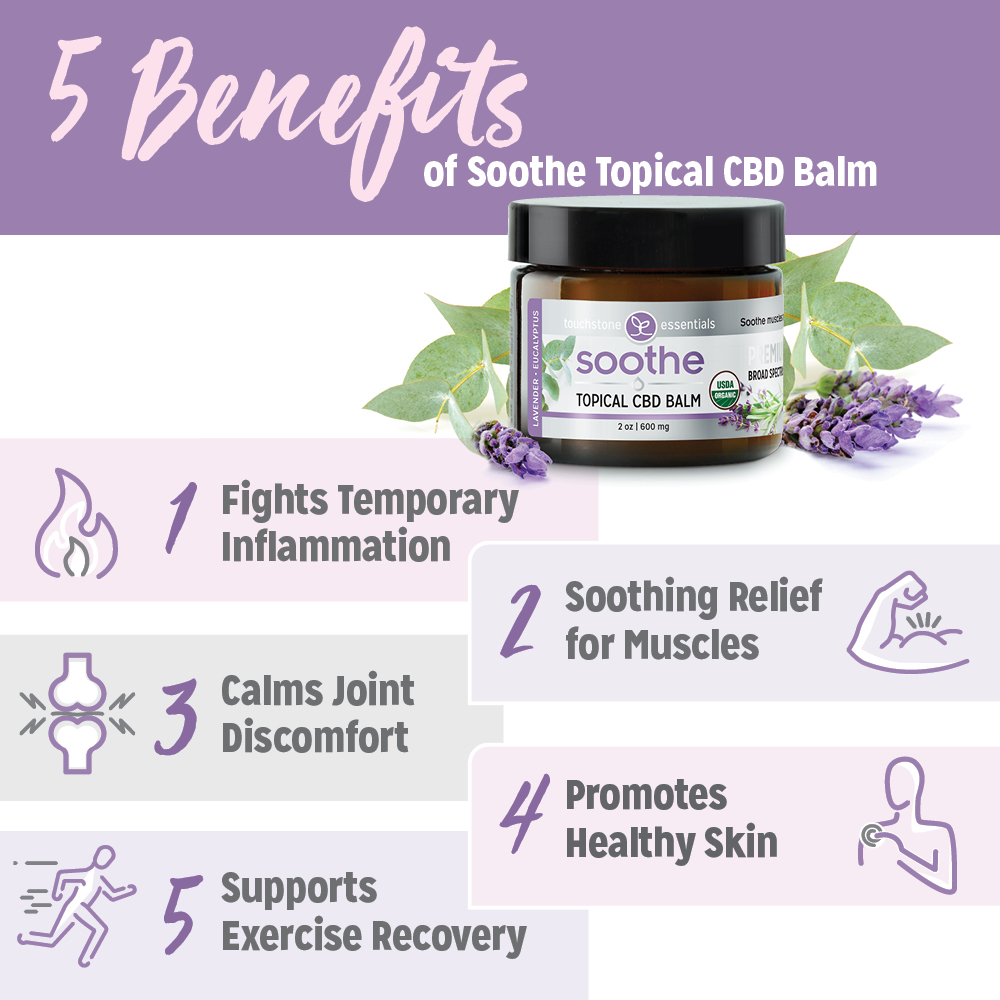 Whether you’re a professional athlete, or a weekend warrior, we all suffer from muscle discomfort from time to time. But if you have Soothe CBD Balm, relief is at hand. Broad spectrum CBD oil, MCTs, and the beneficial essential oils lavender and eucalyptus help rub out muscle aches.